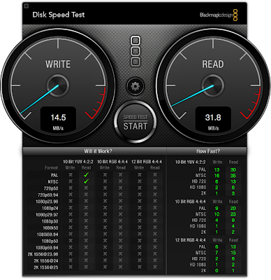 無料のディスクパフォーマンス測定ツールである、"Blackmagic Disk Speed Test"でパフォーマンスを測定しました。