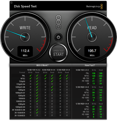 無料のディスクパフォーマンス測定ツールである、"Blackmagic Disk Speed Test"でパフォーマンスを測定しました。