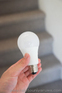 引っ越した先の賃貸テラスハウスは、台所の天井に照明がありませんでした。そこで取り付けることを考えたのですが、キッチンはカウンタータイプで、キッチンが壁とカウンター上の収納で挟まれており、あまりスペースがありません。また、収納の扉を開けると照明とも干渉しそうな予感がしたため、電球を取り付けることにしました。しかし普通の電球ではなくてLED電球にすることにしました。初めてのLED電球。