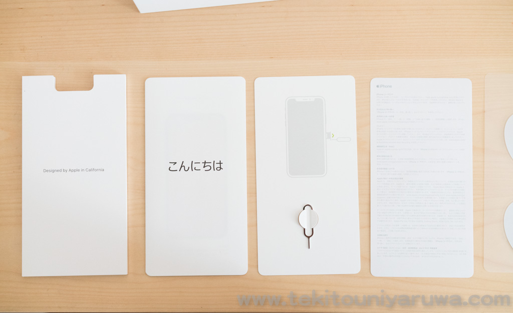 中身。簡易的な説明書にリンゴのステッカー、SIMトレイ引き出し用のピン。