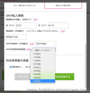 MNP転入に必要事項を入力して「SIMを追加する」を押して次に進みます。